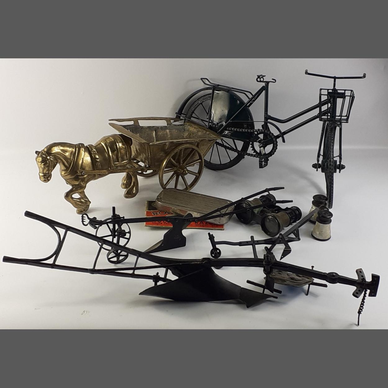 INTERESTING LOT! A box containing a large brass horse and cart 42cm approx, a model of a vintage bicycle 43cm approx, and metal models of ploughs, 2 sets of opera glasses, a Rolls razor and a vintage RAC badge