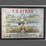 A framed F.H. AYRES advertising print depicting the four sports of cricket, tennis, rugby and hockey, with ‘Manufacturer of Indoor & Outdoor Games & Sports’, and illustrations of sporting figures including W.G. Grace in the centre, from The Robert Opie Collection Museum of Advertising and Packaging Gloucester, frame size 63x46cm
