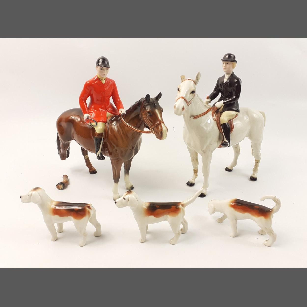 A BESWICK hunt group comprising one male and one female figure plus 3 dogs, all with damage and evidence of previous repairs - BUT JUST LOOK GREAT!