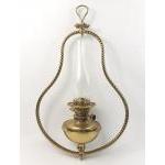 An ANTIQUE hanging oil lamp marked with Messenger's no 2 on wick control, comes with chimney and bottom tab, 60cm tall approx