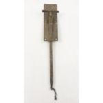 A vintage brass bell pull with plate and antique pull in shape of clutch and bar. Plate measures 20x7cm