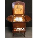 A beautiful wooden sewing storage box, appears Edwardian with RD757105 registration mark. Much sewing paraphernalia set into the lid, lower drawer with lock and key with contents including buttons and threads