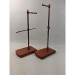 A pair of haberdashery shop display stands in brass on modern wooden stands. Stand 45cm tall