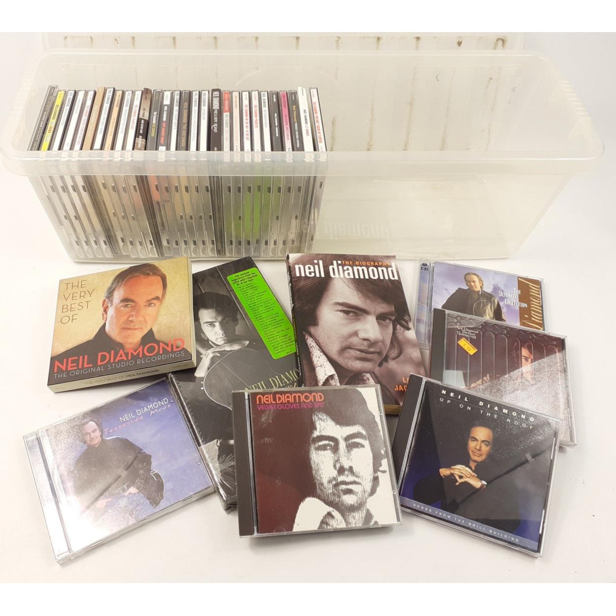 A plastic storage box of CDs of NEIL DIAMOND with a sealed pack of 'NEIL DIAMOND IN MY LIFETIME' 3CDs and 70 page book. Over 30 discs, all in good condition
