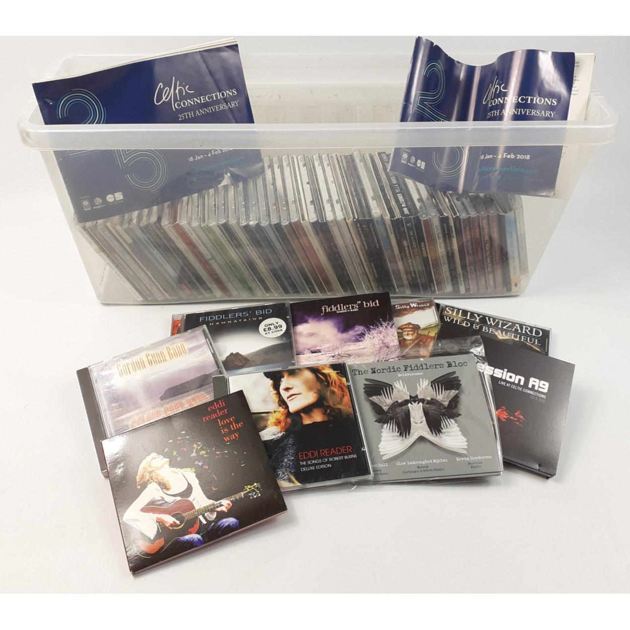 A plastic storage box containing a quantity of CDs in good condition with a Celtic/ Scottish Rock theme, to include Capercaillie, Eddi Reader, Nordic Fiddlers, Celtic Fiddlers, Silly Wizard, etc
