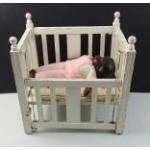 A small black doll with bisque head and cloth limbs in modern dress, standing 37cm high. Comes with vintage white wooden cot H36xW35xD25cm