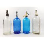 Four traditional soda syphons including VICTORIA WINE, SMITH'S of Milton Bridge, and 2 BATEY & CO. There is a crack on the inside of the blue Batey's bottle. Each offers a 1/- deposit return