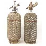 Two vintage soda syphons each clad with a metal mesh, possibly made by Sparklets in the 1930s.