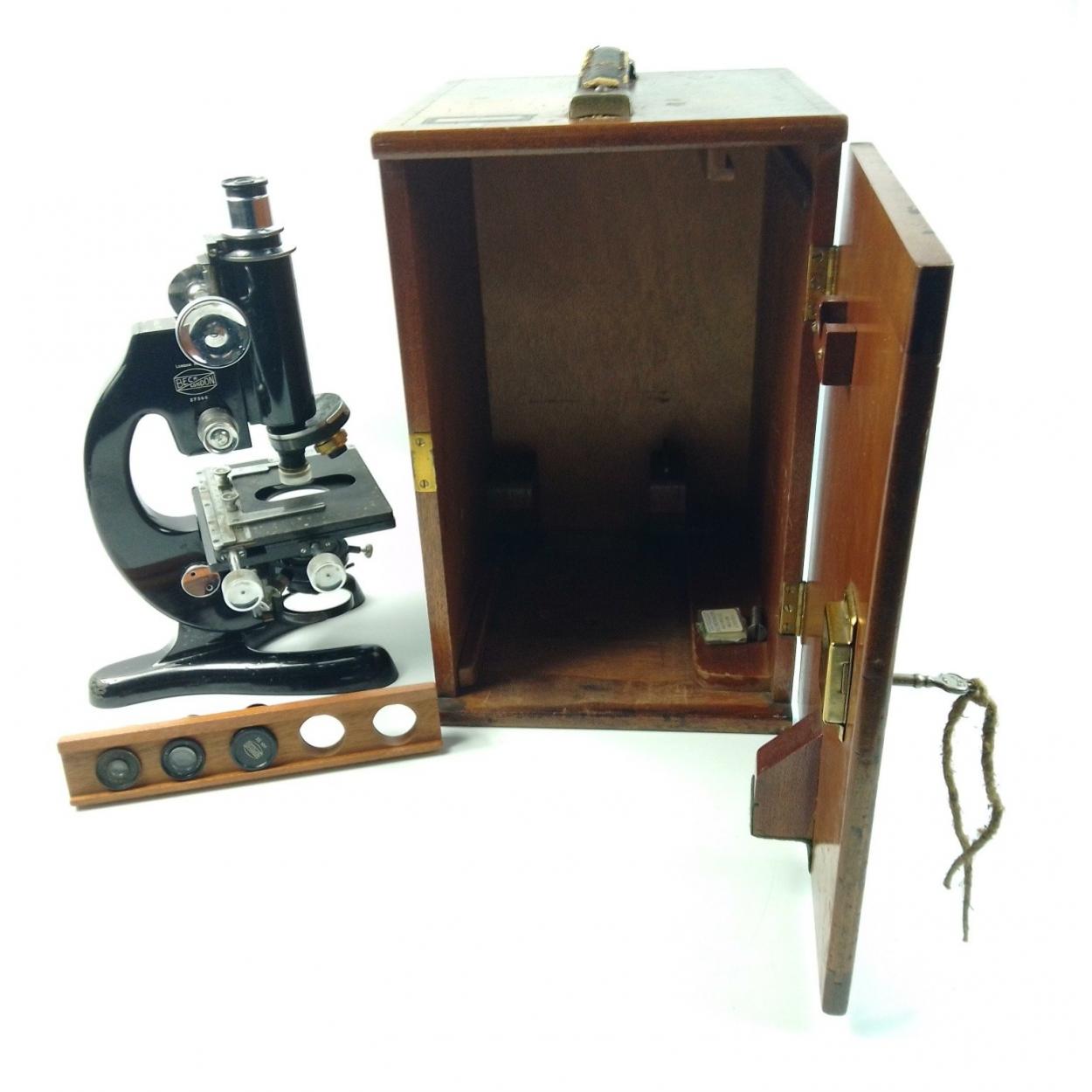 A BECK of LONDON model 47 No. 27566 microscope in original wooden case with three additional lenses. Appears to be in good order