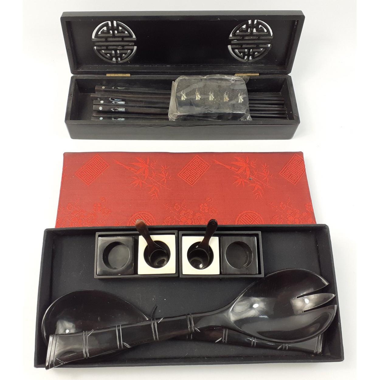 A small ORIENTAL lot to include a boxed set of chopsticks with stand and a separate box containing rice serving spoons
