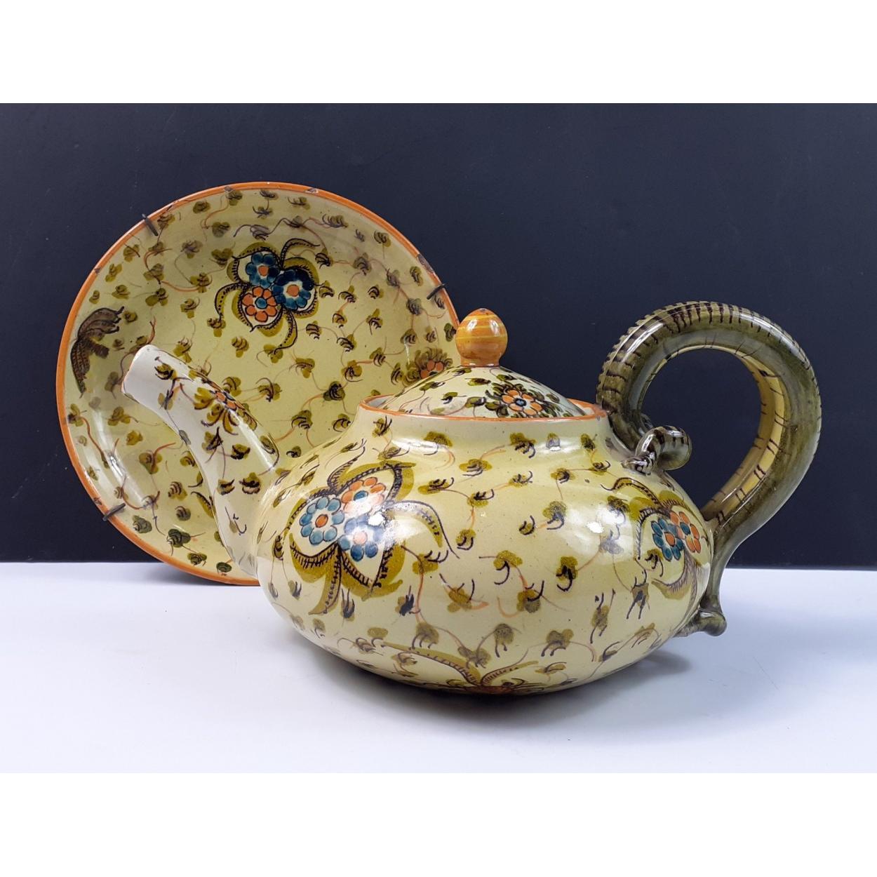 An antique Italian Cantagalli style squat teapot and matching wall plate, beautiful floral design with almost reptile like handle almost representing a vine. Slight cracks noted to glaze, Wallplate with edge damage, teapot with minor chips to lip but displays beautifully.