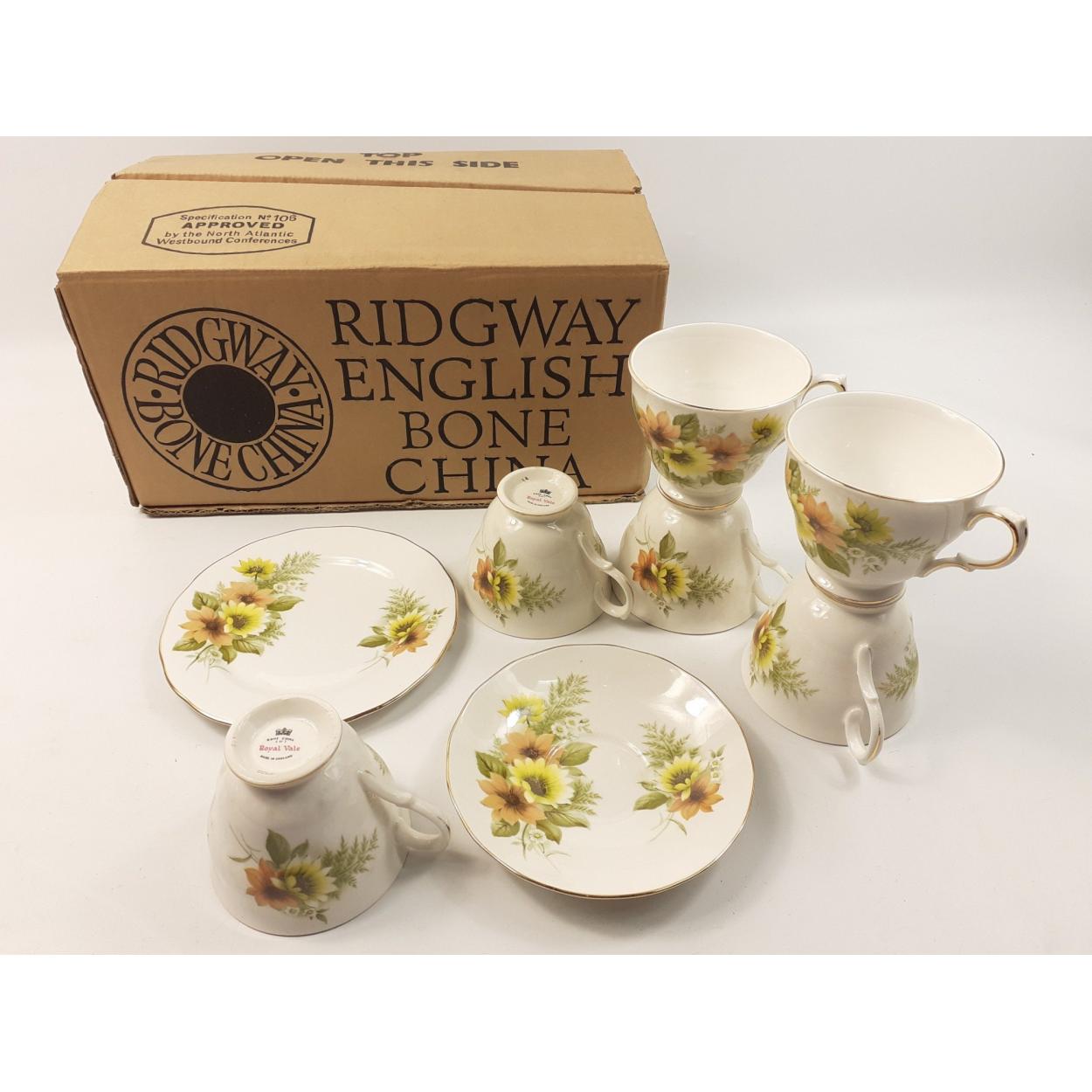 RIDGWAY ROYAL VALE tea service in box. Comprises six each of side plates, cups and saucers. A very pretty floral pattern and in good condition.
