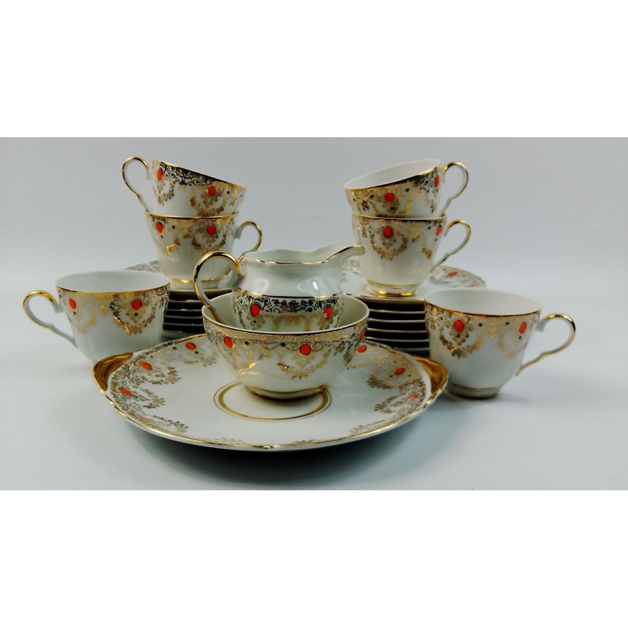 A super tea set comprising 22cm sandwich plate, six side plates, six cups and saucers and a sugar and cream bowl. All in excellent condition. A very pretty patterned Fine Bone China set with 22kt gold accents.