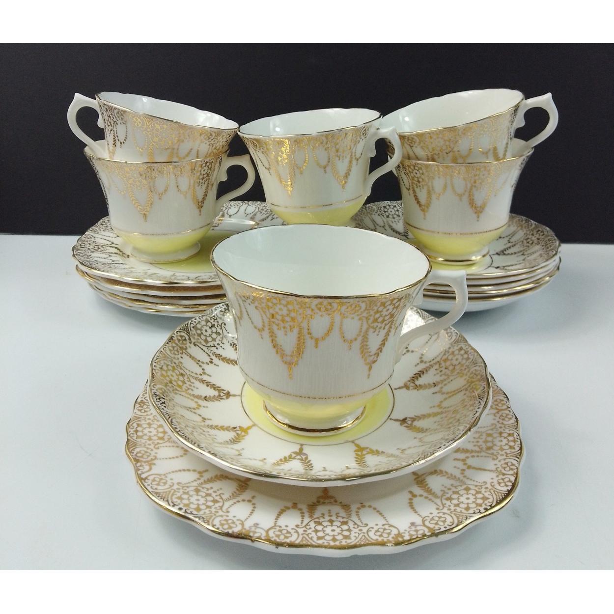 An ASHLEY Fine Bone China tea set comprising six each of side plates, saucers and tea cups. Accented in 22kt gold. All pieces in good order.