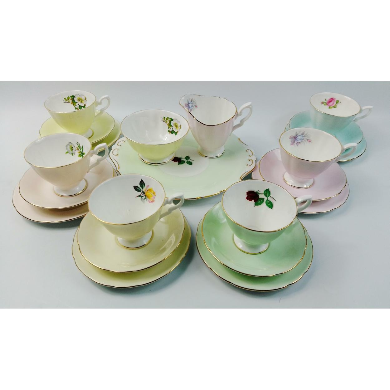 A Royal Standard fine bone china tea service to include sandwich plate, 6 pastel harlequin cups and saucers, 6 side plates plus a sugar and cream. All in good condition apart from pink cup which has a repaired handle