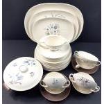 A POOLE pottery dinner service in understated floral pattern with cream background comprising 6 twin-handled soup bowls, 6 x 20cm plates, 6 x 23cm plates, 6 x 27cm plates, 3 ashets, 30cm, 36cm and 42cm, 1 lidded serving bowl (20cm dia), 1 small sauceboat, 3 saucers (18cm). All in good condition bar one tiny chip in rim of serving bowl