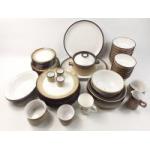 A vintage DENBY dinner service comprising 1x27cm plate, 8x20cm plates, 8x17cm plates, and others plus large ashet, 2 oven to table oval dishes, 1 lidded serving dish etc,