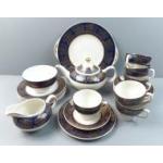 A WOOD & SONS Castile tea service in cobalt and gilt comprising 6 each of cups, saucers and side plates, 1 sandwich plate, 1 teapot, 1 cream and 1 sugar. All in good condition