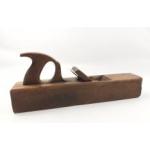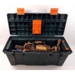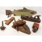 A box of vintage woodworking tools plus a large painted salmon and a doorbell.