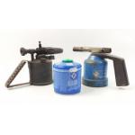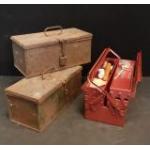 Two well-used metal boxes used as tool boxes plus an expanding toolbox in decent condition with haberashery contents