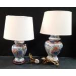 Two Oriental lamps on wooden plinths taller 59cm to top of shade. With floral design
