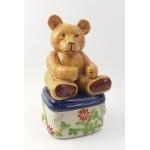 A charming ceramic teddy bear sitting on a stool. Stands 24cm high approx with no damage