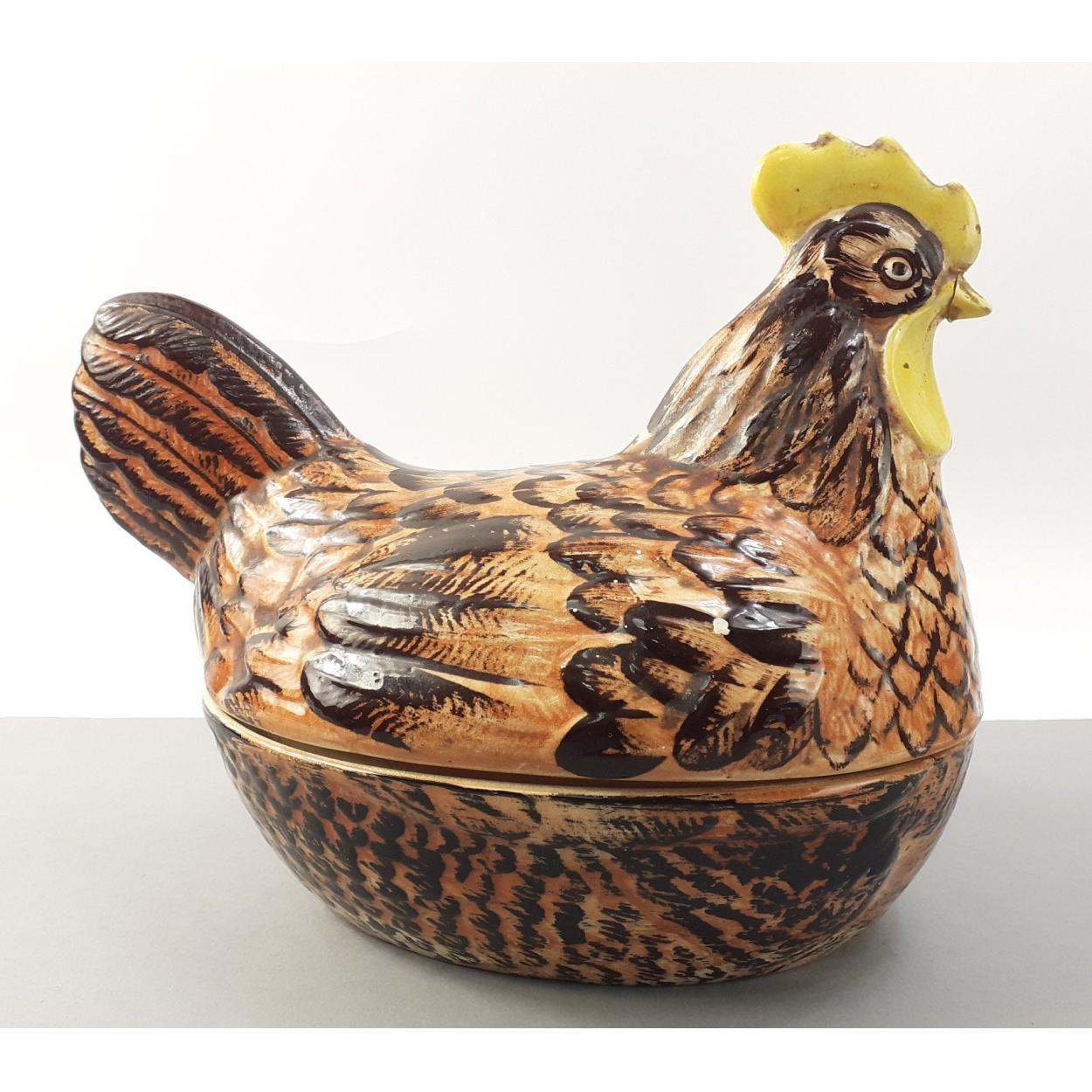 A vintage ceramic chicken egg basket with re-attached nose and a hairline crack to the base, 21cm long approx