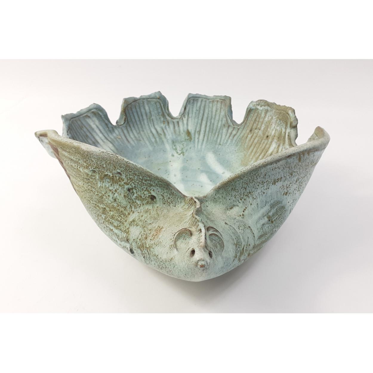 A studio pottery fruit bat shaped fruit bowl. 25cm across at wingtips. Most unusual