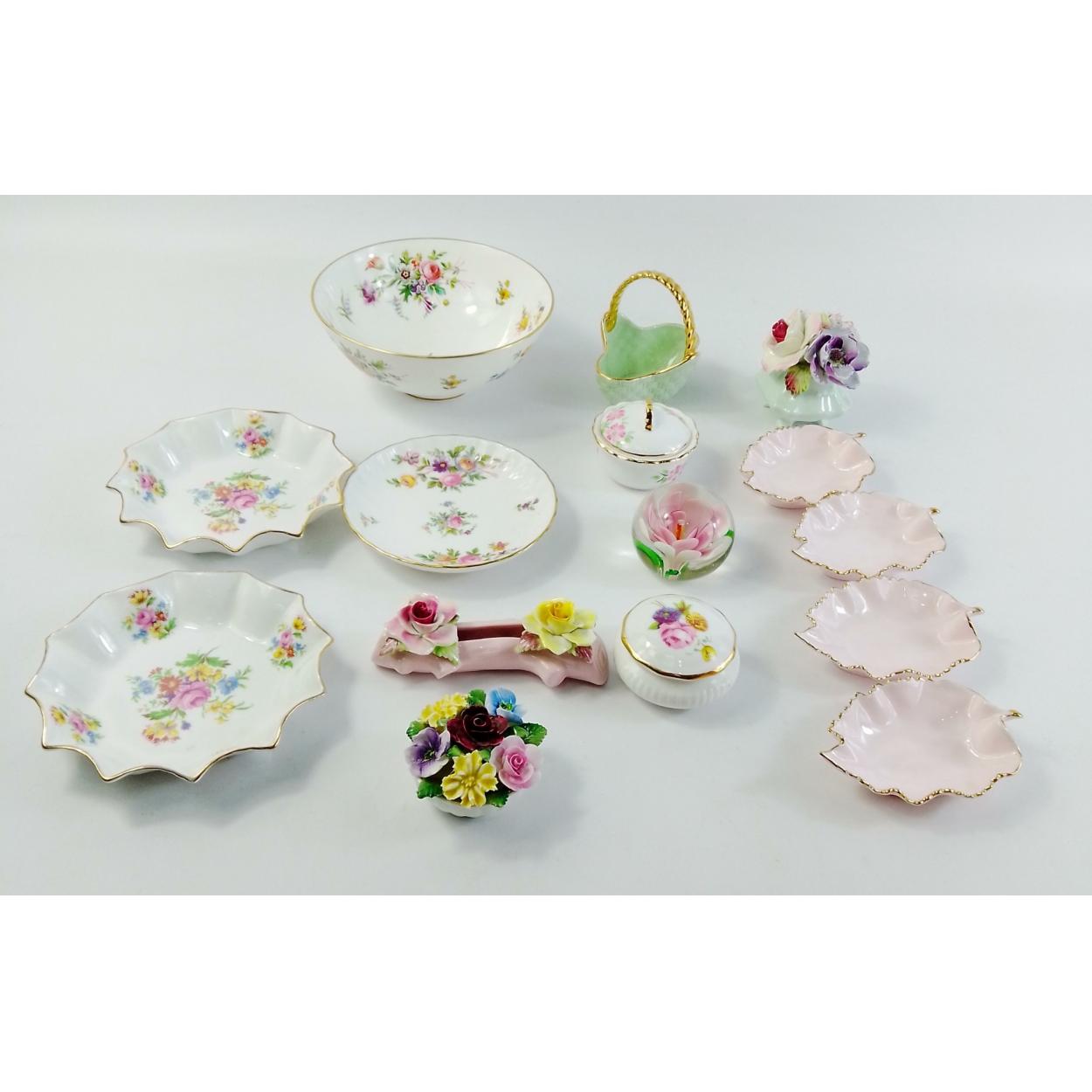 A collection of pretty small ornamental china items to include a MINTON bowl, dish, ROSINA dishes, RADNER floral basket, RADNER floral log and others. All in good condition