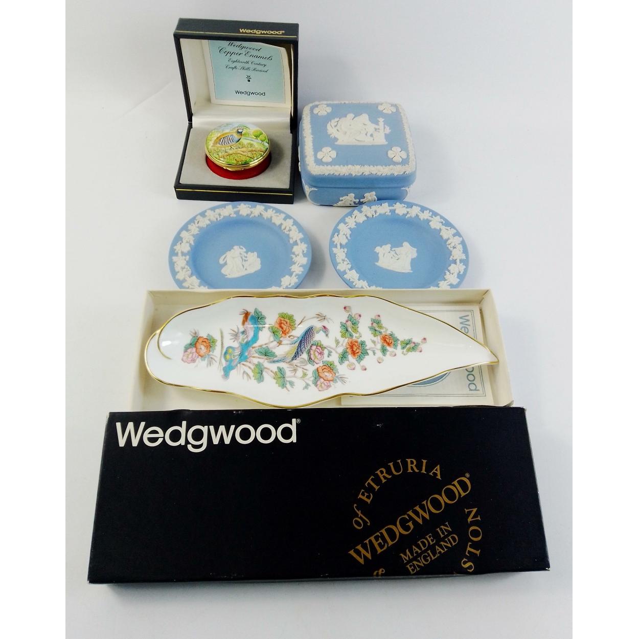 A small collection of WEDGWOOD items including a boxed Kutani crane dish, a copper enamel pill box and 3 jasperware items