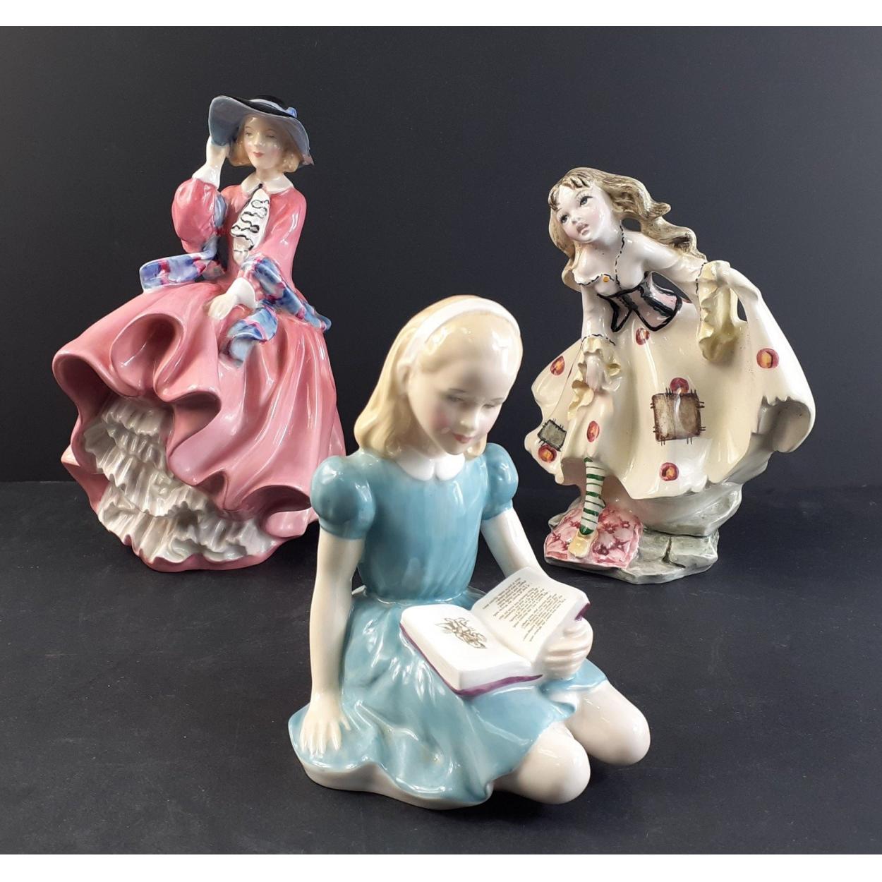 A small collection of pretty figurines to include ROYAL DOULTON Alice (HN2158) in lovely condition, Top of the Hill (HN1849) with 2 small chips to dress, and an Italian Cinderella figurine 16cm high approx