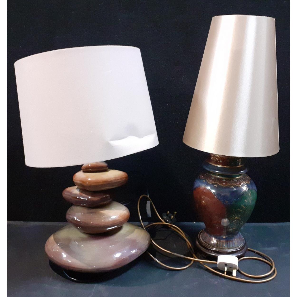 A ceramic cairn style table lamp with shade, stands 60cm to top of shade approx plus a converted ginger jar table lamp on a wooden plinth with shade standing 65cm high with shade