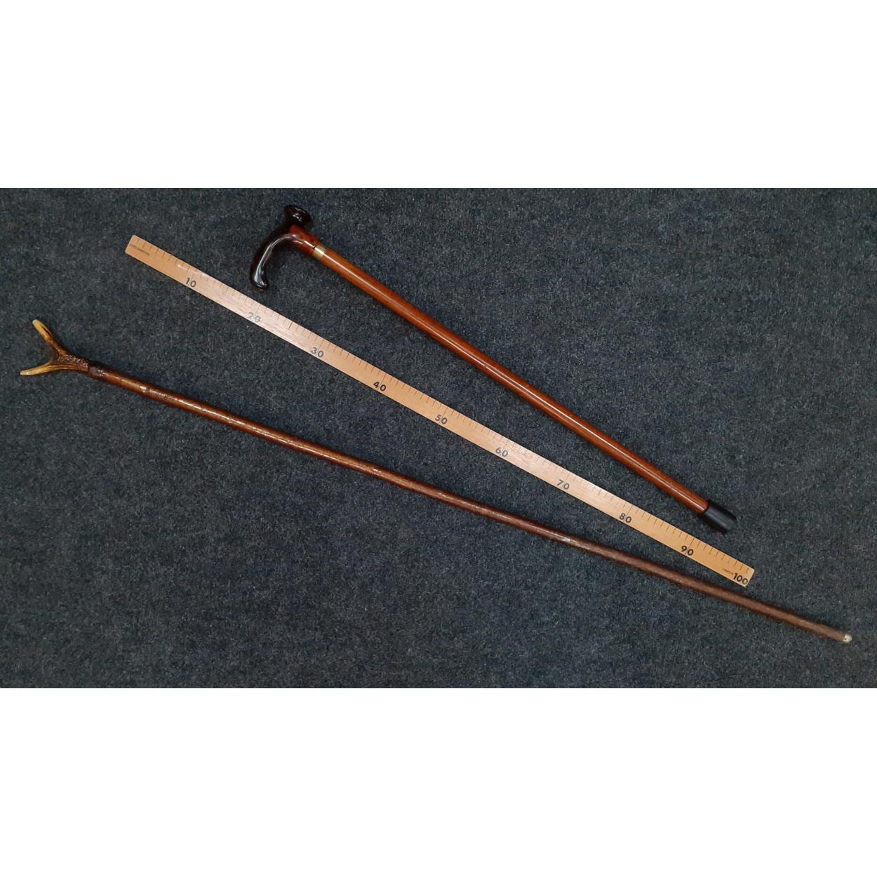 A shepherd's crook with a forked handle, one modern walking cane and a one metre rule