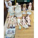 A super collection of bisque headed modern collectors dolls. Includes HEUBACH and other quality German made. Ten in total and lot includes a number of display stands.