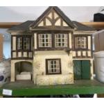 A VINTAGE DOLLS HOUSE complete with an assortment of furniture with nice wee colourful curtains in each window - the hinges in the main opening door require some screws to fix back in place and a good clean etc