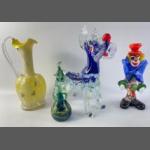 A large vintage MURANO Scottie dog, standing approx 25cm tall plus a smaller Murano clown 20cm tall, a tulip topped yellow glass jug (23cm tall), and a glass seahorse