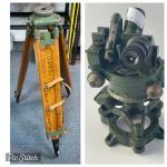 A VINTAGE THEODOLITE OAK stand with accompanying theodolite - complete with leather straps and working instrument
