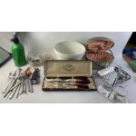 A mixed box of mainly kitchenalia to include an intriguing white metal single swinging-handle oval box fully padded and lined with pink velvet (must have contained something precious at one time), a very large enamel roaster (approx 40cm long), a soda syphon, a very large white ceramic pudding bowl, silver plated tableware and cutlery