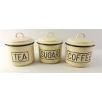 A set of three Polish enamel storage jars for tea, sugar and coffee each approx 15cm tall, diameter13cm