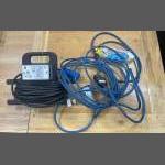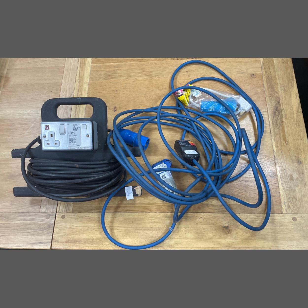 A length of outdoor electrical cable with a unopened mains adaptor fitted with an 16amp site plug plus one further coil of outdoor cable