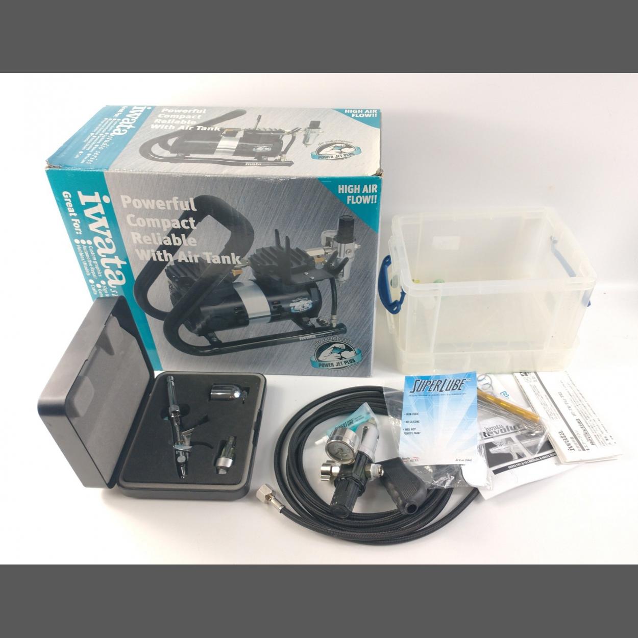 IWATA boxed powerful compact and reliable air compressor with air tank and a box of accessories Revolution attachments etc
