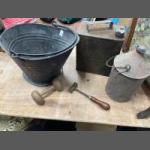 A vintage PRATTS petrol can with a galvanised coal pail etc