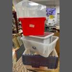 STORAGE SOLUTION! A collection of plastic storage containers - the largest is lidded dimensions for this larger one is 56cm x 40cm x 30cm height approx - five containers all together