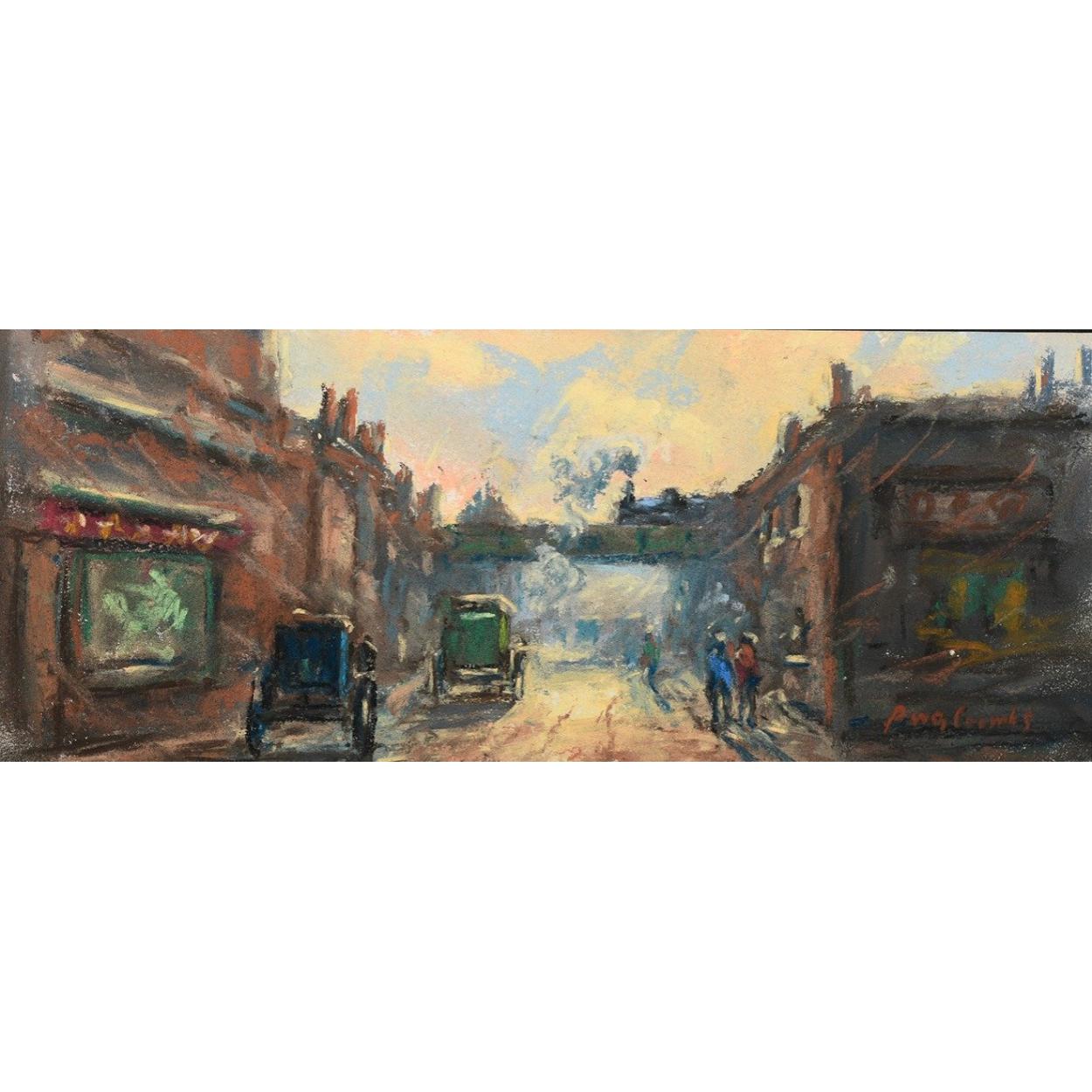 An original framed pastel by the English artist PETER COOMBS, depicting a delightful street scene.. H: 37cm W: 52cm D: 4cm