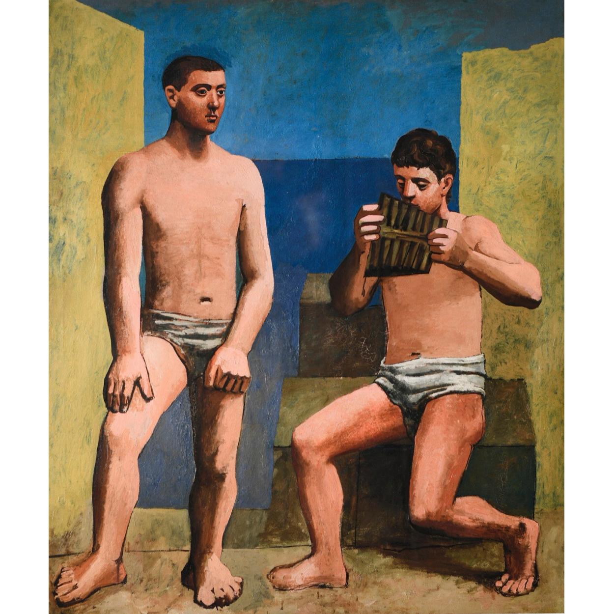 A rare limited edition of the 1923 PABLO PICASSO painting "The Pipes of Pan" was published as a numbered edition of only 60 worldwide plus 2 "Master Printers Proofs" of which this is number 2. Complete with certificate (signed by the Master Printer) Framed and mounted and supplied with a replacement valuation for £1800 (free of charge) along with biographical details on the subject and artist. Composed in 1923, whilst on holiday in Antibes, France, The Pipes of Pan is the crowning achievement of Picasso's neoclassical period of the 1920s. The Pipes of Pan is regarded as the most important painting of this period, not only because of its theme, but also because it draws upon classical interpretations of art in a new and modern style. This monumental painting depicts a mythological scene, set in the Mediterranean, in which two classical figures stare out towards a lost Arcadia, Pans homeland. The figures are heavy, sculptural and contemplative. In the painting Picasso transforms Pan, the ancient Greek god of shepherds and flocks who has the hind legs and horns of a goat, into a young boy. Picasso's Pan reveals none of the laziness or lustiness of the original Greek god. The origins of Pans pipes lie in the ancient Greek tale of Syrinx, who was pursued by the amorous Pan and chased into a river, whereby she turned into a hollow reed. Pan then cut the reeds and fashioned them into the first musical pipes. Throughout Picasso's many periods of transition, he would often refer to various mythological figures, one of the most famous being the Minotaur. Yet Picasso was not primarily concerned with the old myths but rather by their transformation into modern 20th century art.. H: 97cm W: 82cm D: 4cm
