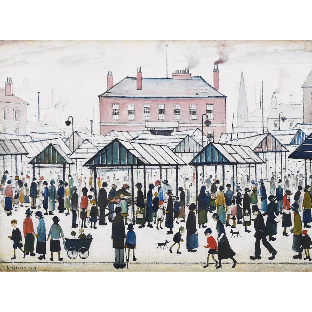 One of only 99 published worldwide. L S LOWRY limited edition titled "MARKET SCENE, NORTHERN TOWN, 1939" with signed certificate of authenticity (signed by the Master Printer) Framed with special bespoke frame and intricate mount. NOTE: Supplied with a replacement valuation for £1500 along with biographical details on the artist. (Free of charge) Lowry's painting of the 'Market Scene, Northern Town' was painted in 1939. Lowry is renowned for his images of busy urban landscapes of northern towns with figurework often referred to as 'matchstick men'. This painting is of Pendlebury Market in Salford that was near to Lowry's home. The large crowd includes people from all walks of life, from families to businessmen, suggesting that Lowry captured the market on a busy Saturday.. H: 81cm W: 94cm D: 4cm
