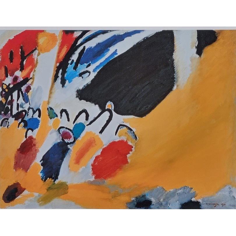 This WASSILY KANDINSKY limited edition titled "Impression III (Concert), 1911" was published as a numbered edition of only 75 Worldwide of which this print is one from the edition. Complete with a certificate of authenticity signed by the "Master Printer". Each print in this edition has been hand sorted and fully inspected by the Master Printer. Professionally framed to a high standard in a bespoke frame and art mounted. Note: supplied with replacement valuation certificate for £1800 along with biographical details on the artist (free of charge). Condition is excellent. On January 2nd, 1911, Kandinsky and other members of the Neue Kunstlervereinigung Munchen, attended a concert featuring works by Arnold Schoenberg. This painting is reality in dissolution, but still present with the grand piano, audience shapes, yellow representing irrepressible vitality and colours and sound going together. This was the first painting that he made after the concert and the word impression referred to paintings that reproduced a direct expression of an internal nature. This picture is not the particular concert he heard, but his overall impression of the music performance however the central image of the painting is the black angular block representing the piano, so this particular concert is at the heart of the picture. It floats on a yellow sound. The listeners, shown as circles and arcs, are covered in the sound but at the same time are focusing on the piano. The music that so influenced Kandinsky was three piano pieces from 1909.. H: 110cm W: 130cm D: 4cm