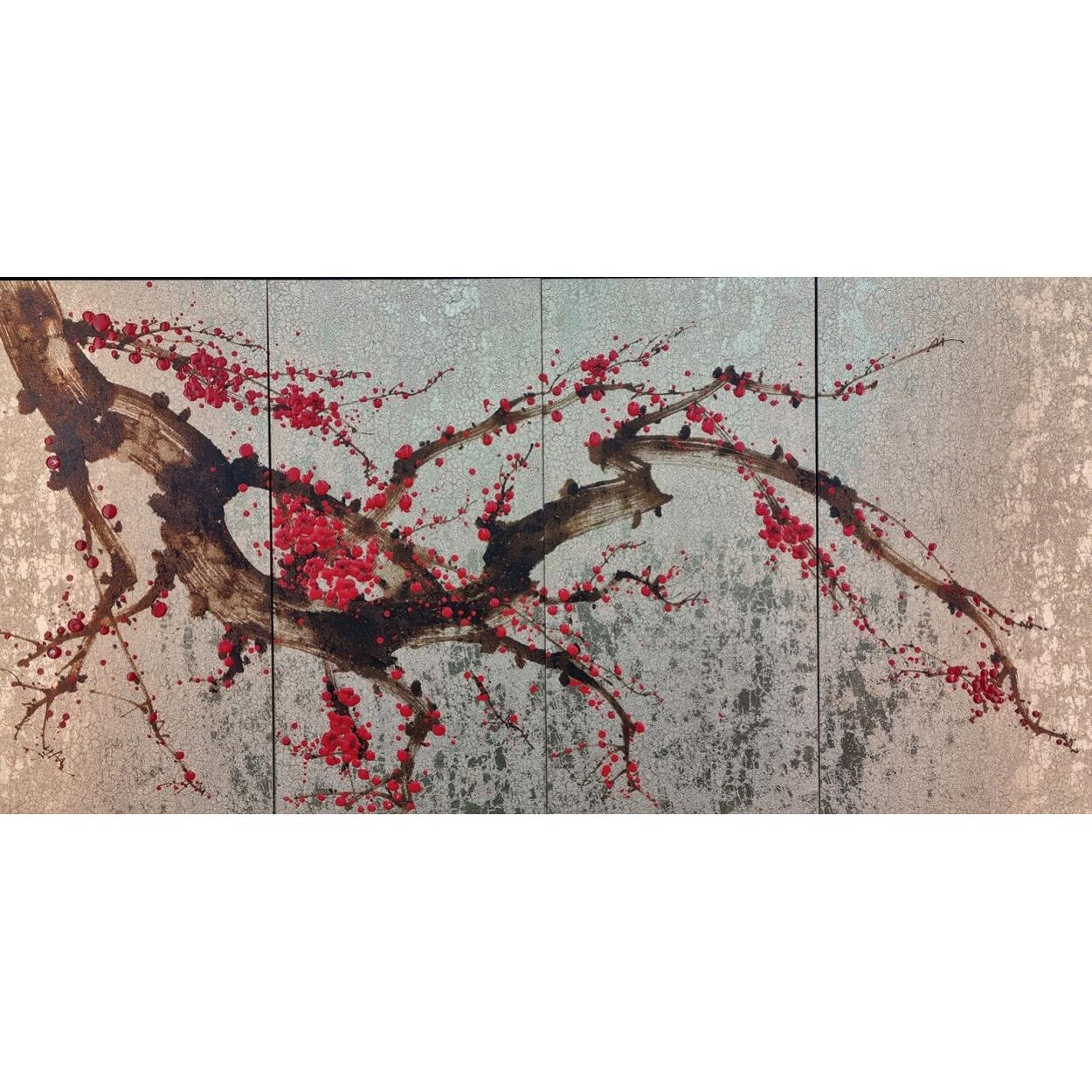 A hand-painted four panel screen with gold leaf style work which can be displayed as one item or separated into four panels. Each panel is approx 80cm x 40cm x 4cm. H: 80cm W: 160cm D: 4cm