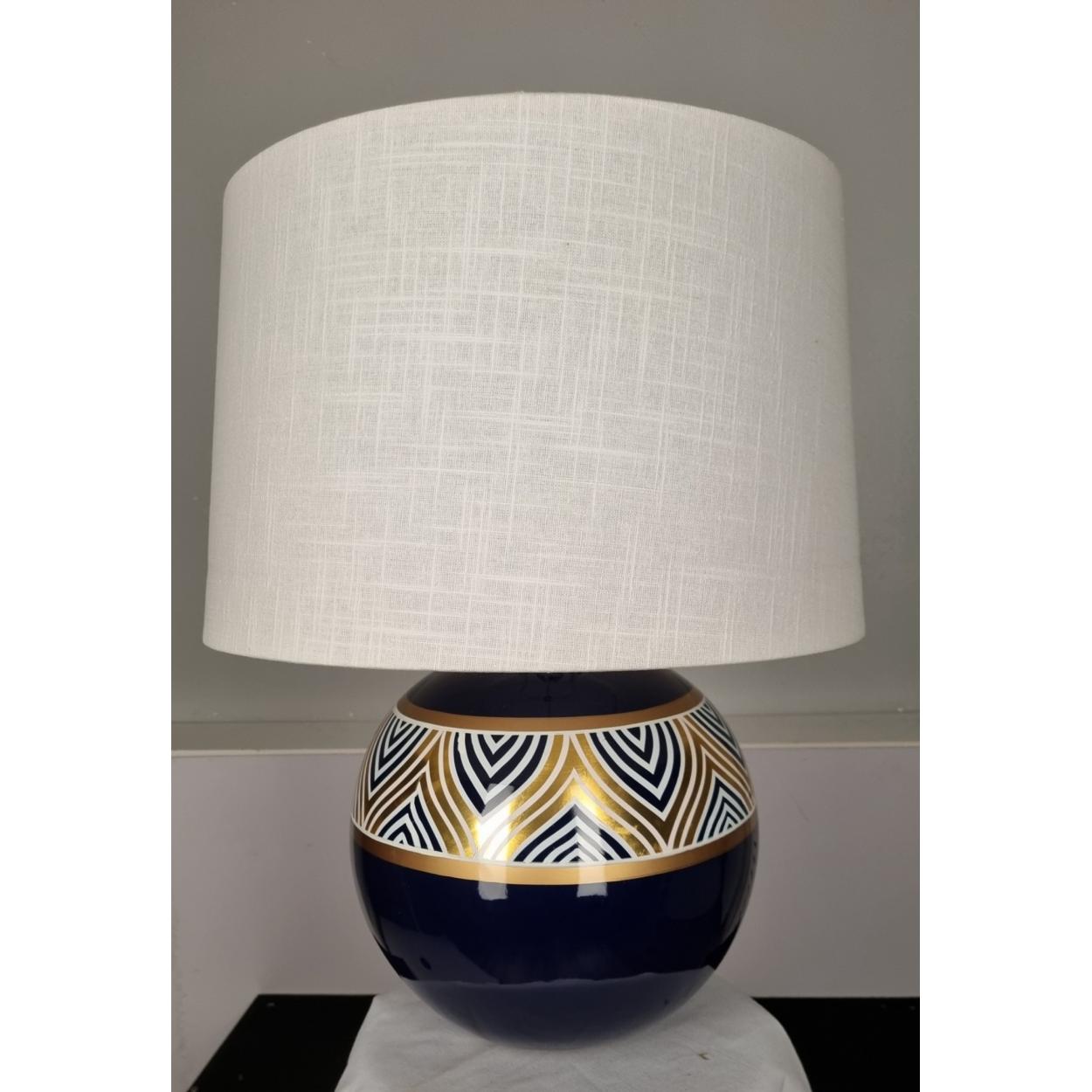 A porcelain blue and cream hand painted lamp with gold embossed detail. Display shade shown supplied free of charge.. H: 67cm W: 40cm D: 40cm