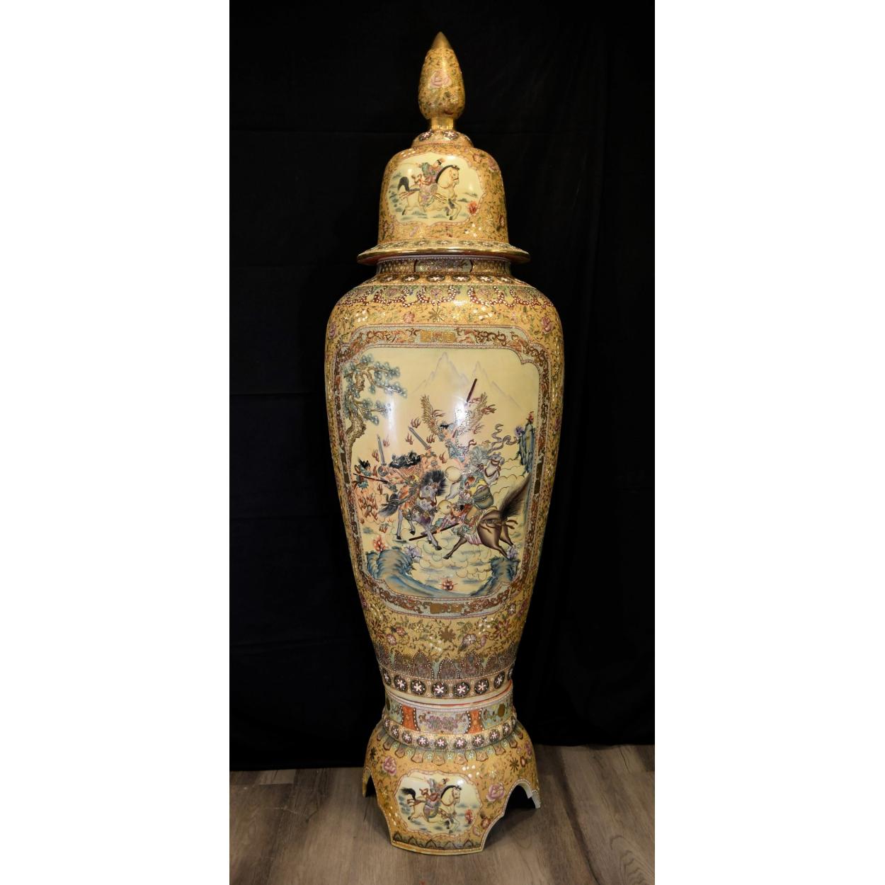 A hand made Chinese porcelain trophy vase with high grade painting and gold detailed finish. Origin Shantou Circa 1990 Condition Good. One Temple jar only in this lot.. H: 84cm W: 27cm D: 21cm